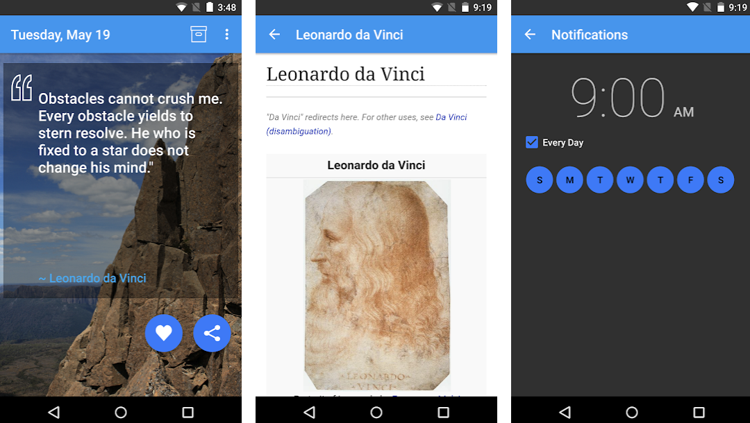 This app has a large number of quotations for various purposes. You can receive offers, save them or share them on social networks according to your wishes. You also have choices like you can set reminders and send daily offers to your smartphone. You can also choose a random background photo or color for the daily quote.