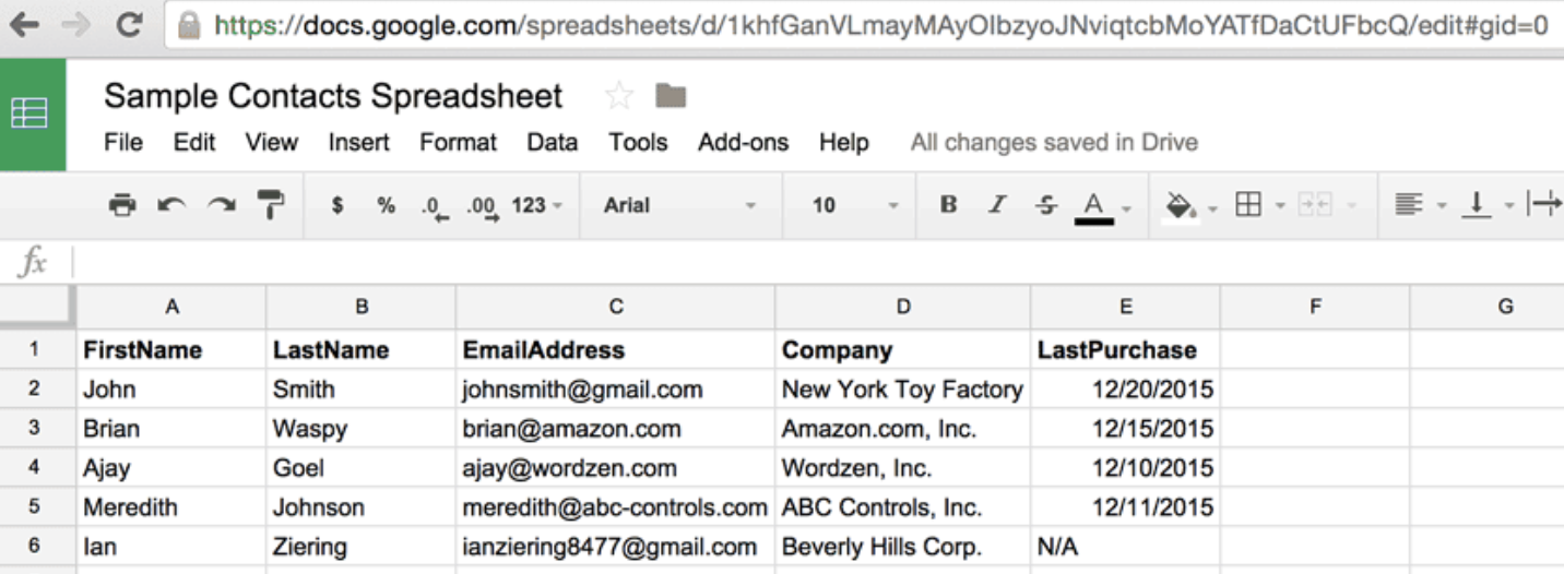 First, create a spreadsheet in plain text. Manage the rows and columns carefully. For instance, maintain 4-5 columns with each name as first name, last name, email I’d, city, state, company name, their purchase, etc. (You can check the above-mentioned image for reference) Now, fill in the details in the rows as per the titles. Make sure to do it correctly.