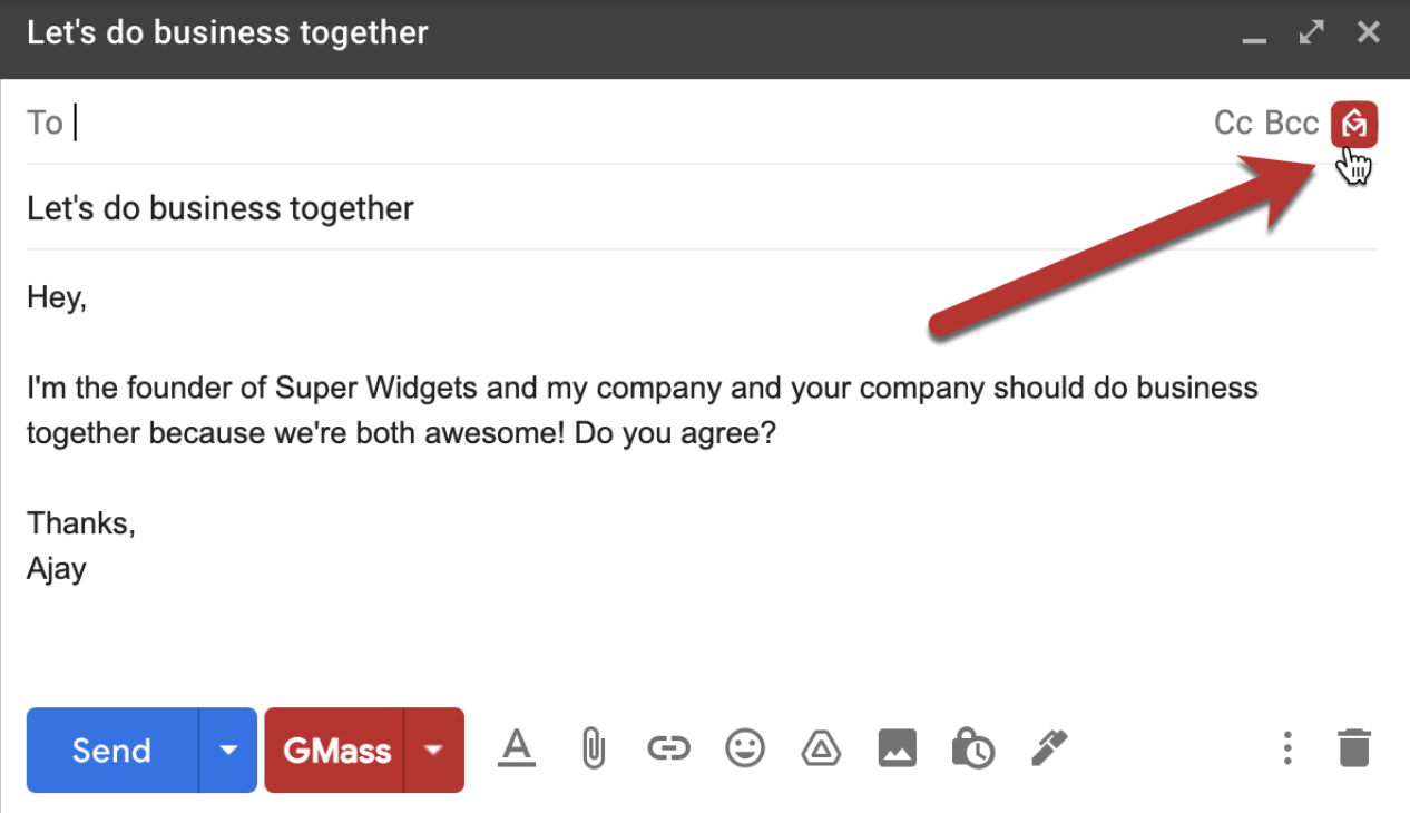Now, after doing everything, double-checking everything, you are ready to go for this last step where you only need to merge. You just need to click on the gmass word in order to send your mail merge.